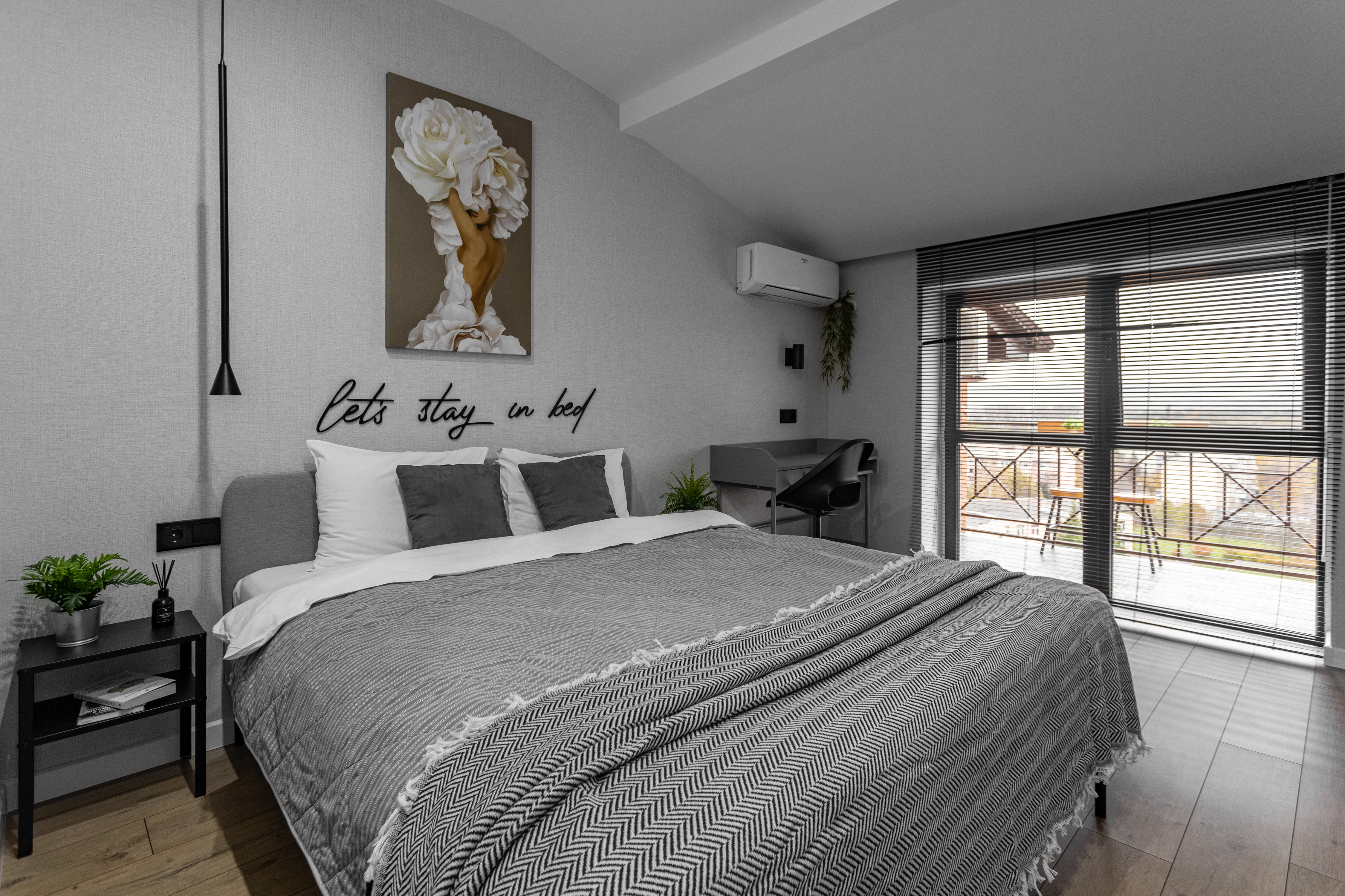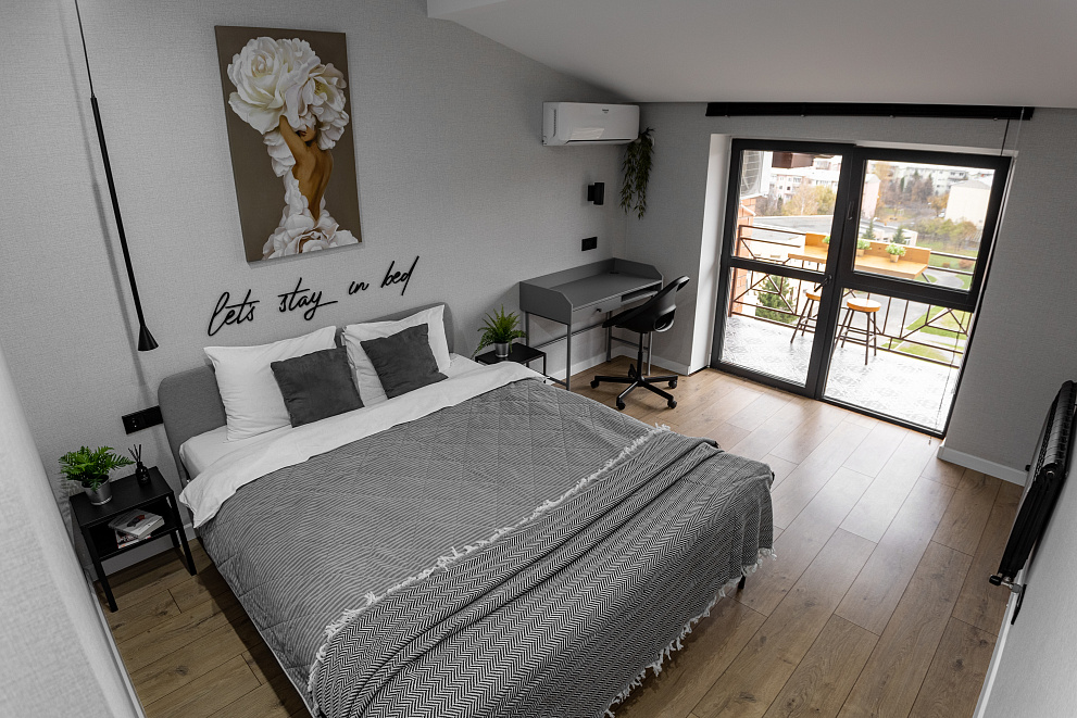 Уютный лофт по проекту известного дизайнера Екатерины Арутюновой ,с панорамными окнами и прекрасным видом на горы прямо из спальни.