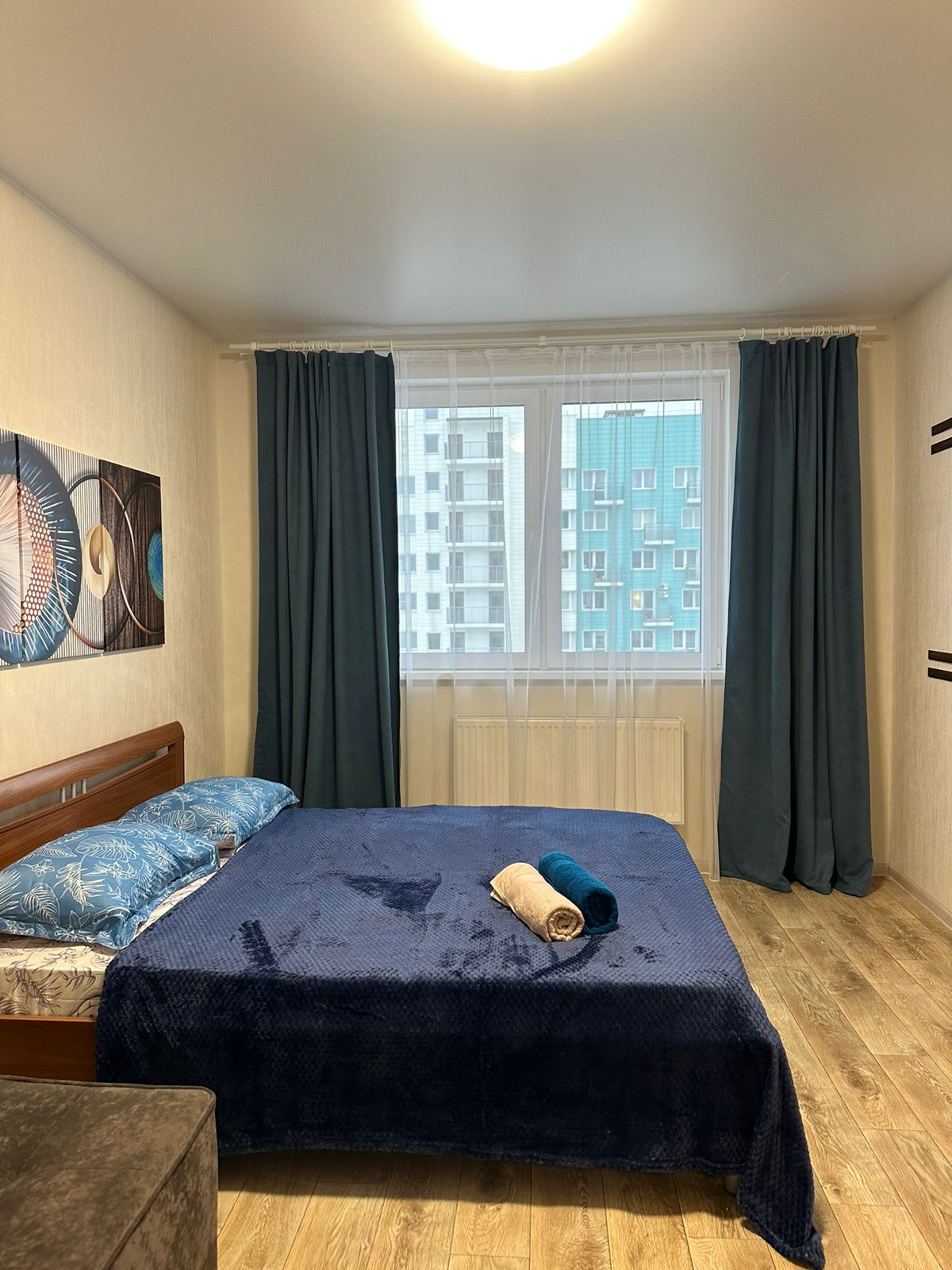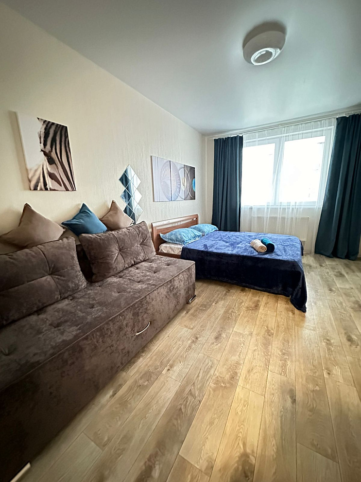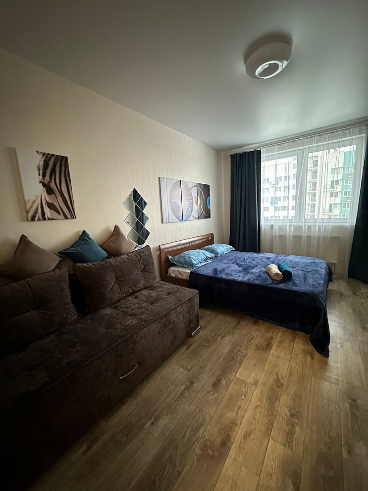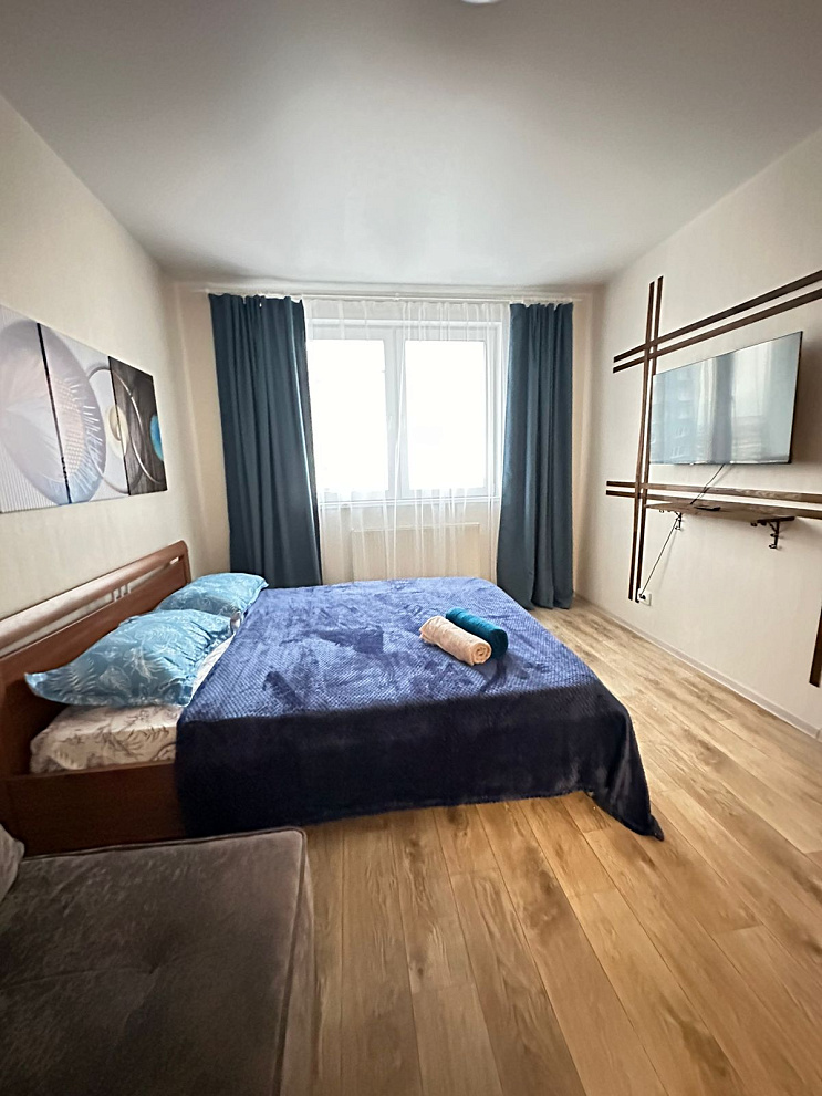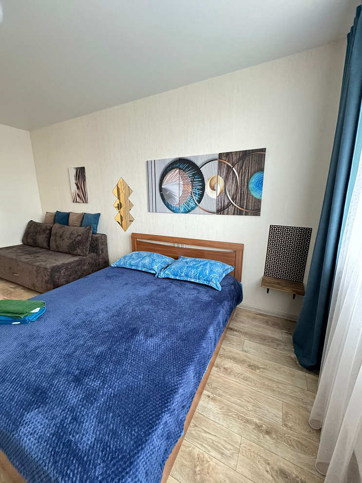 Однокомнатная квартира на высоком этаже. 3 спальных раздельных места. Двуспальная кровать , диван и софа .