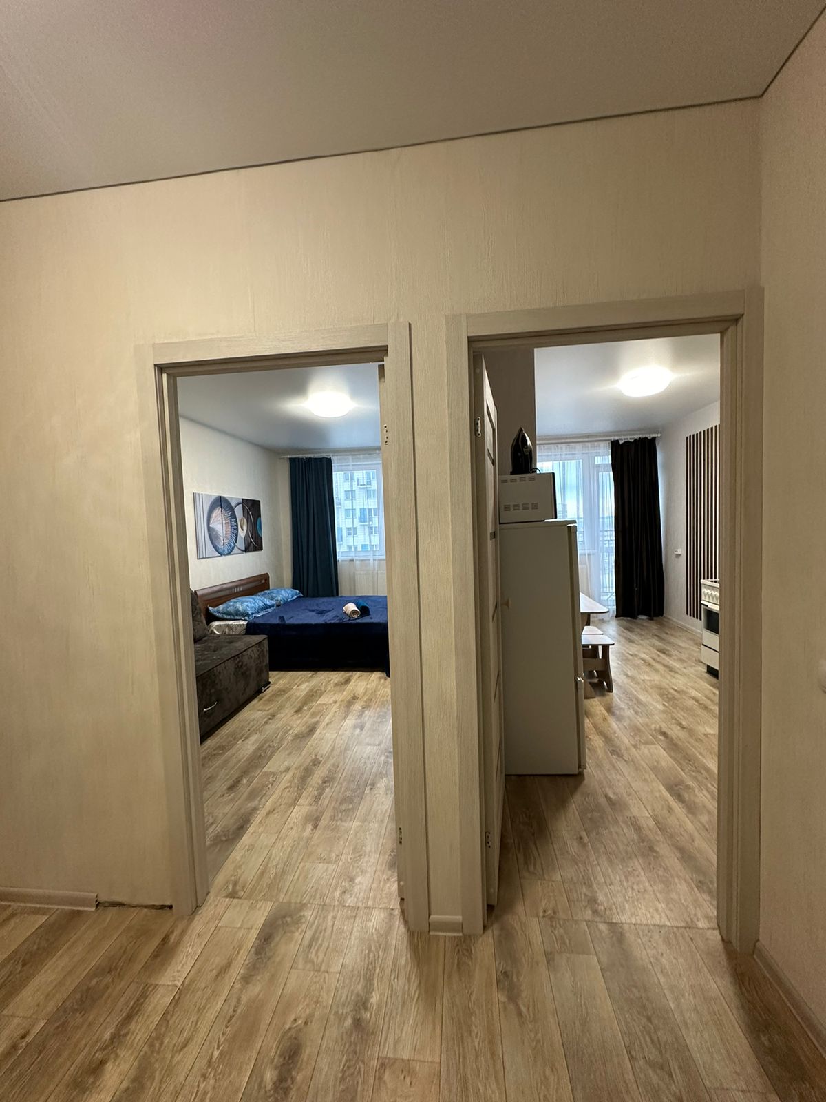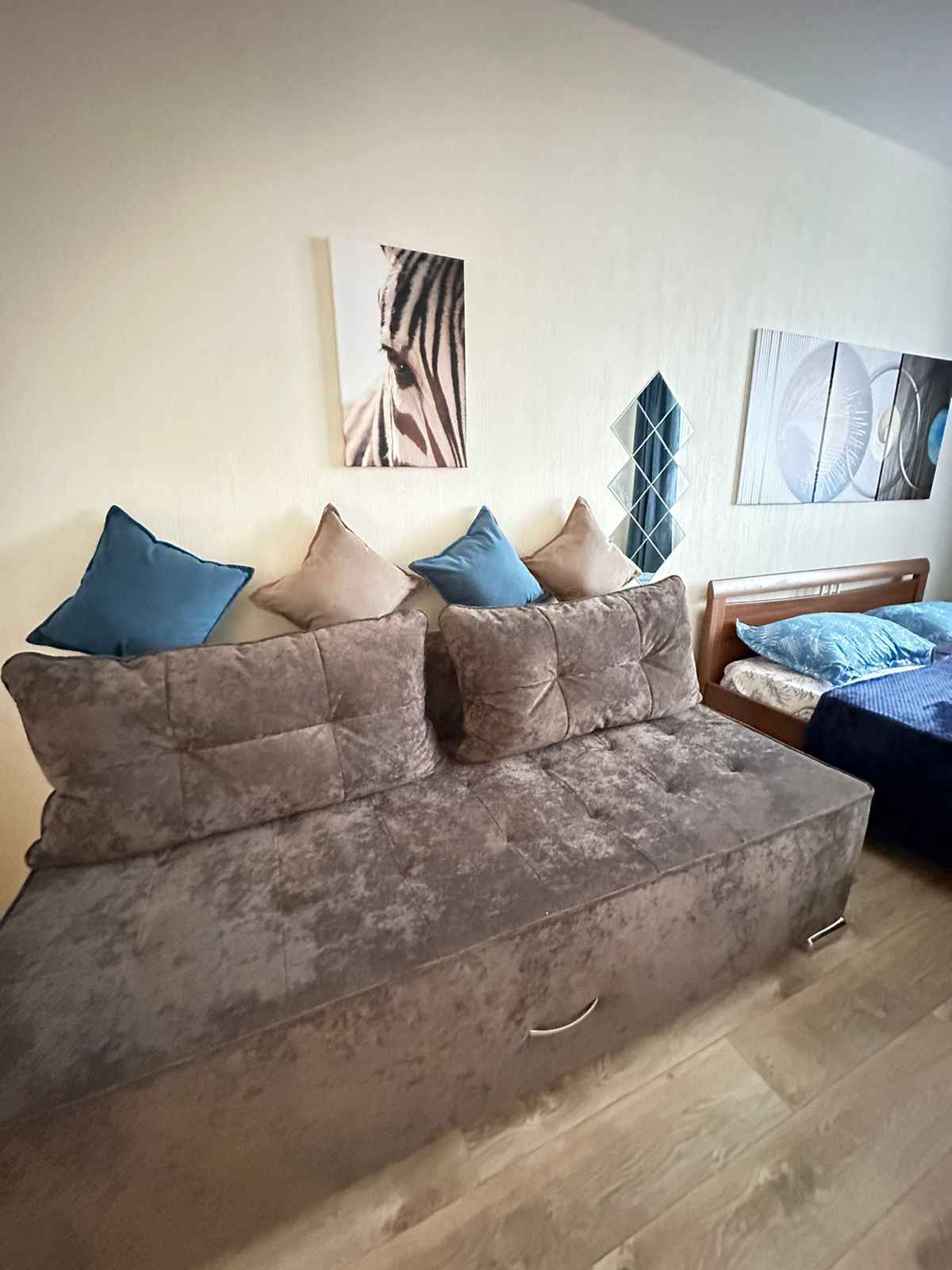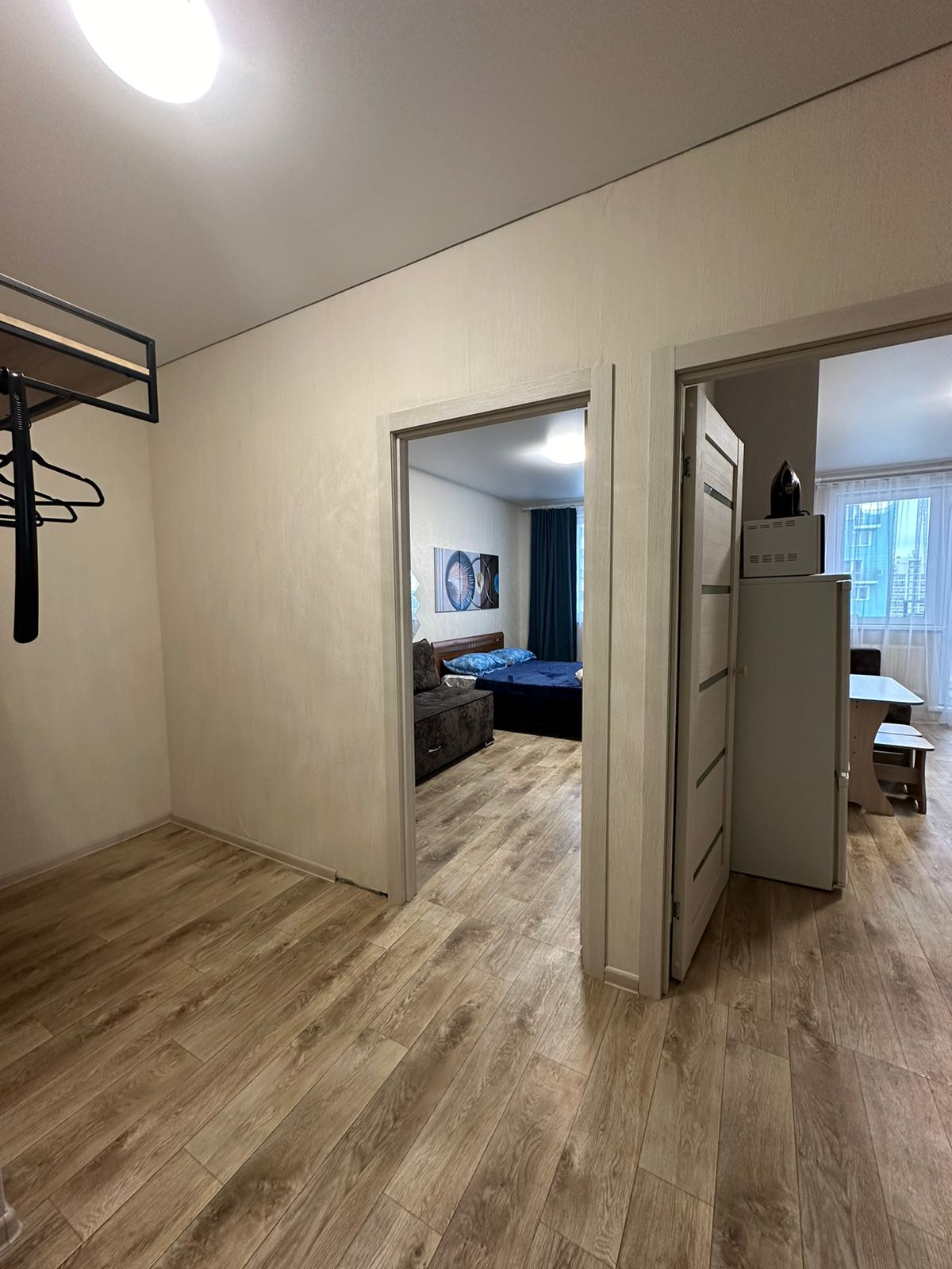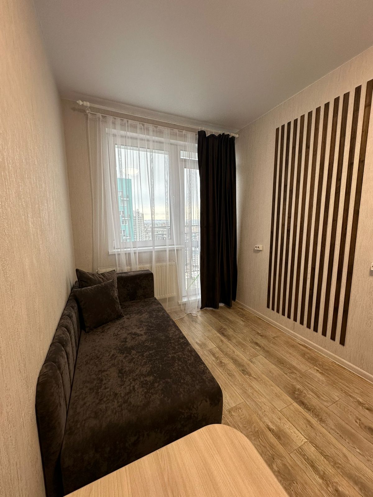 Однокомнатная квартира на высоком этаже. 3 спальных раздельных места. Двуспальная кровать , диван и софа .