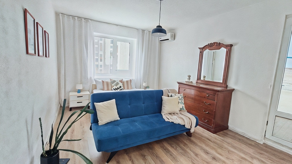Для комфортного сна в 1-комнатной квартире новые раскладные синие диваны Хофф в спальне и кухне+двуспальная кровать с ортопедическим матрасом Аскона.