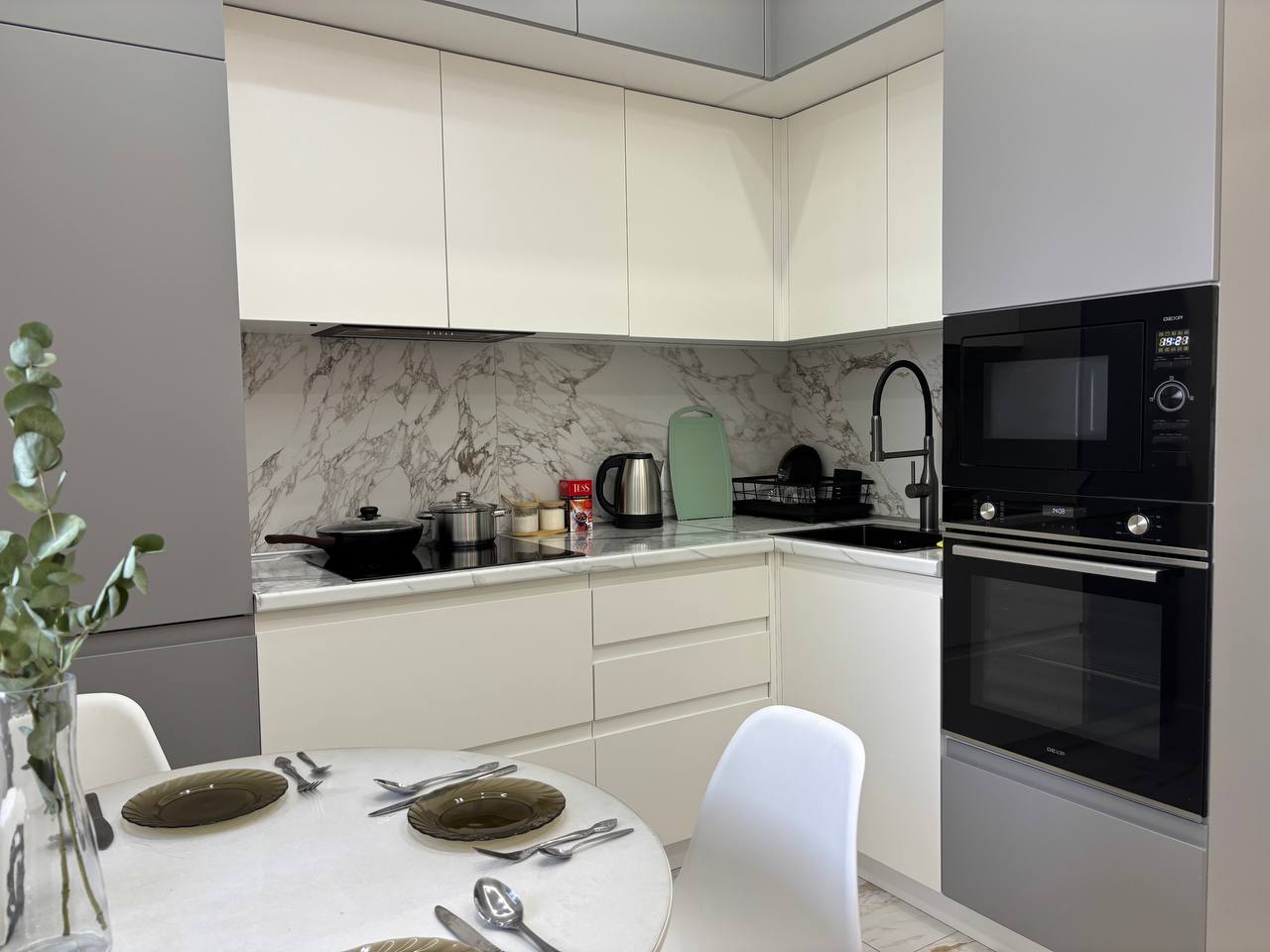 Полностью оборудованная кухня с необходимыми кухонными принадлежностями и посудой
