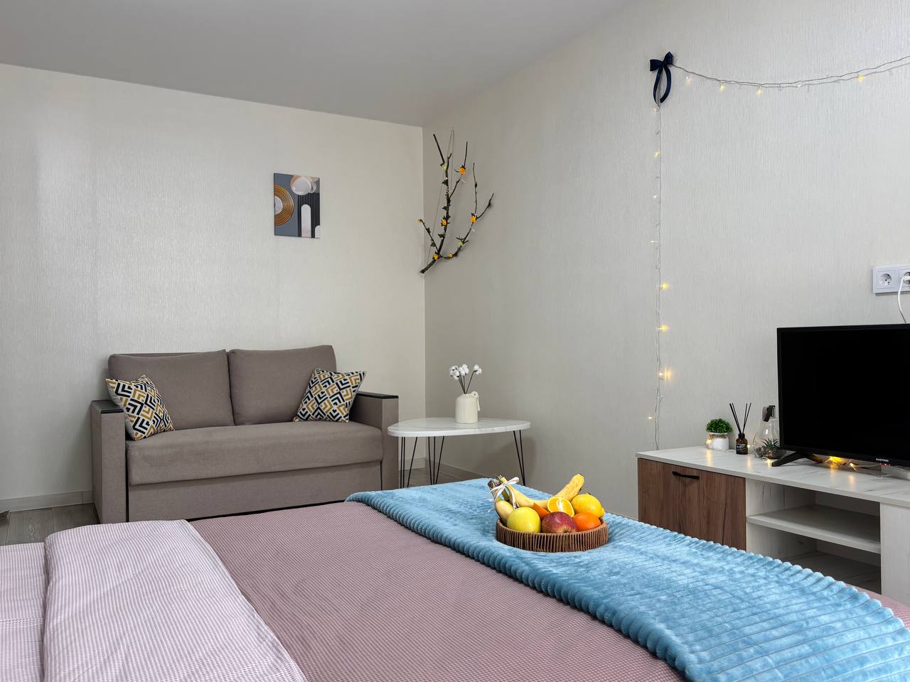 В новой светлой квартире есть всё для комфортного проживания: большая 2-х спальная кровать с удобным матрасом, раскладной диван с дополнительным спальным местом, чистое и свежее постельное белье (100% хлопок), полотенца, фен, средства гигиены, телевидение и Wi-fi, утюг, гладильная доска, сушилка для вещей, лампа торшер.
