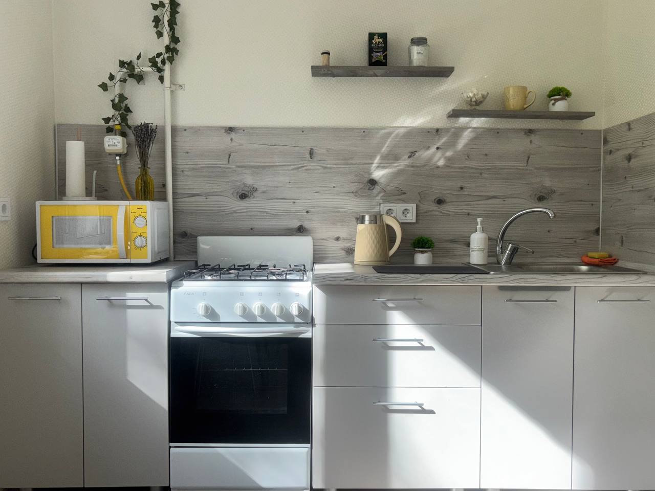 Кухня оборудована всем необходимым: холодильник, газовая плита и духовка, микроволновка, чайник, полный комплект посуды, фужеры, сковородка, кастрюли. Чай, сахар, соль.