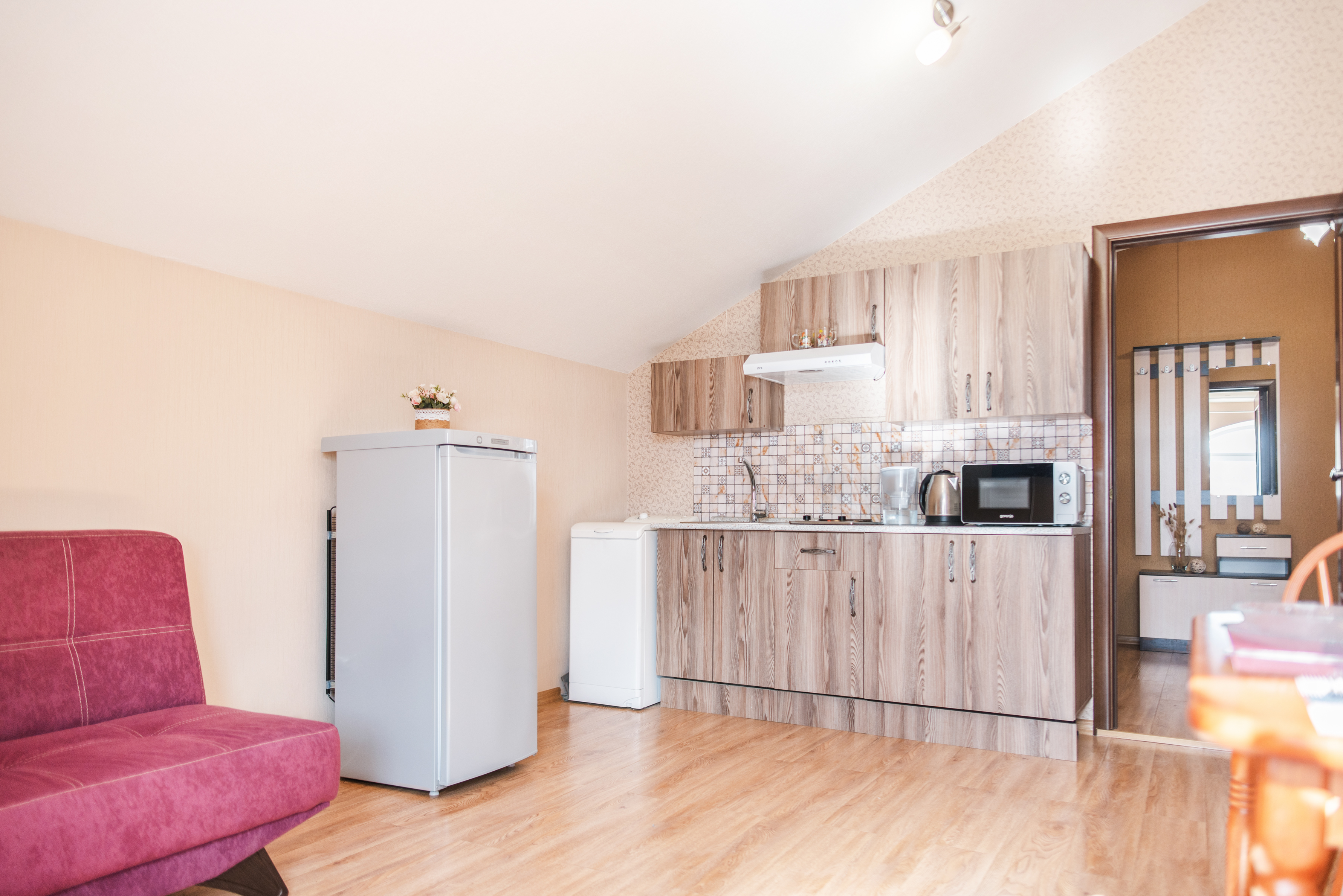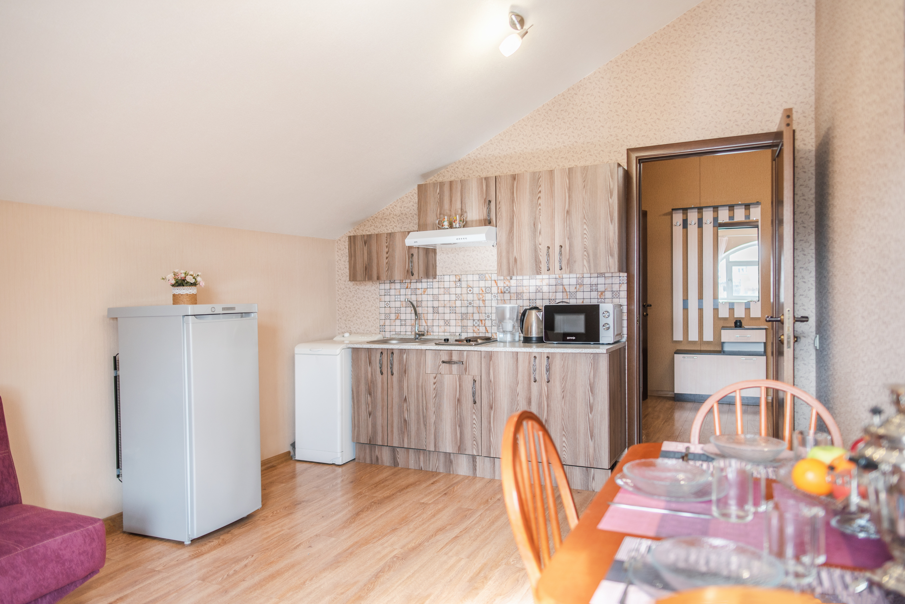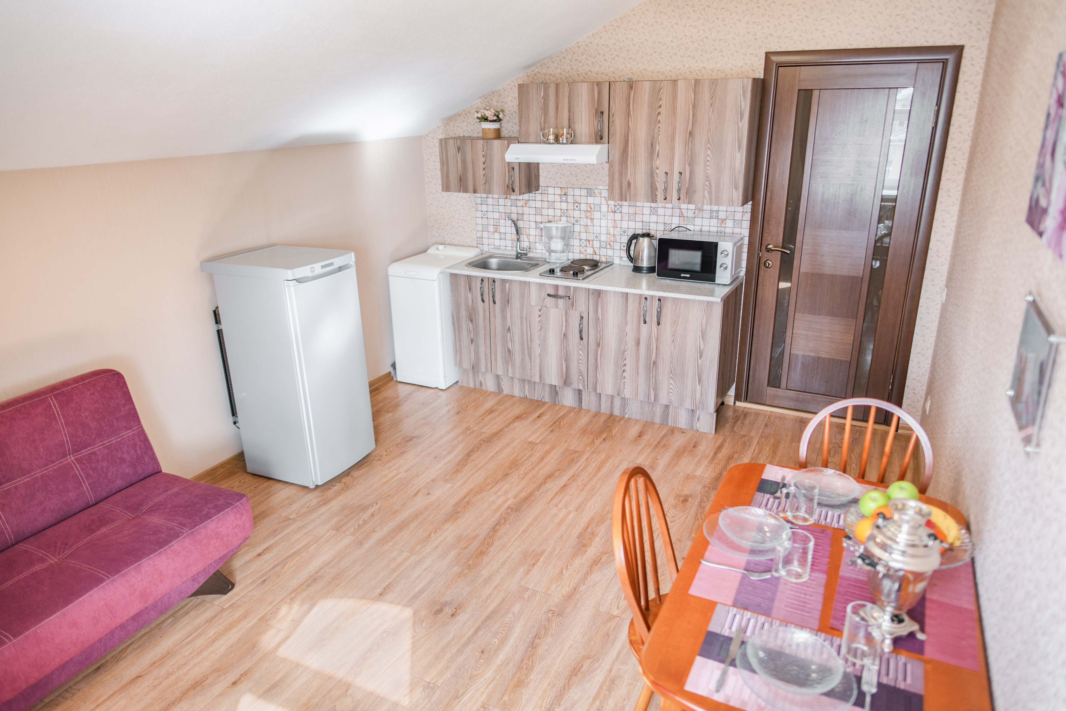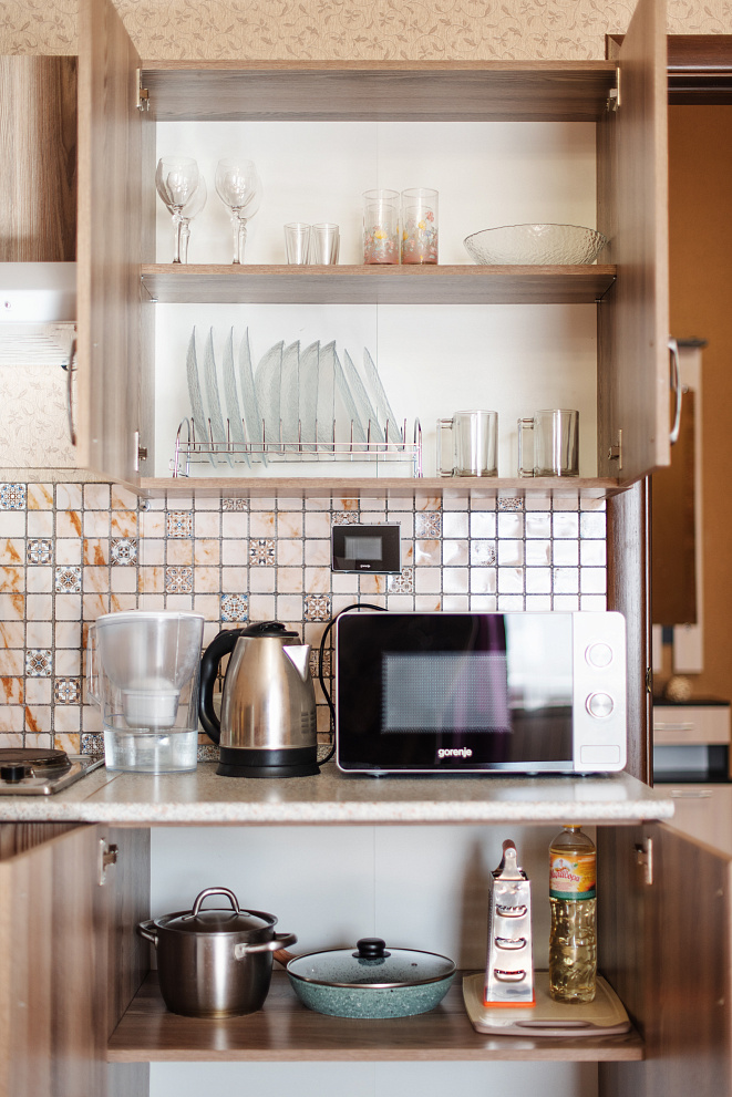 На всех наших объектах есть всё самое необходимое: фен, утюг, стиральная машина, чайник, микроволновка, плита, холодильник, столовые приборы и базовая посуда, чай и кофе.