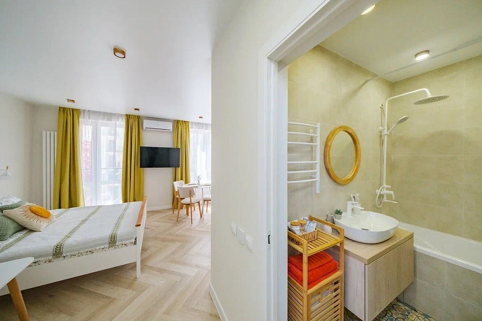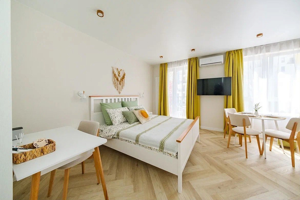 Уютная студия в Кудепсте (Сочи, ул. Искры, 88, корпус 6, кв. 193). Адлерский район. 31 кв.м, для 3 гостей: двуспальная кровать + диван. 5 этаж, балкон, вид во двор. Кондиционер, холодильник, плита, микроволновка, стиральная/посудомоечная машины, ТВ, фен, утюг, Wi-Fi. Постельное белье, полотенца, средства гигиены. Бесконтактное заселение. Ортопедические матрасы, выбор подушек. "Умный дом" с Алисой (управление светом/шторами/теплым полом/кондиционером). С детьми – можно. Животные/курение/вечеринки – запрещены. Документы. Залог 5000 рублей (возвратный). Отдых с комфортом и вниманием к деталям!