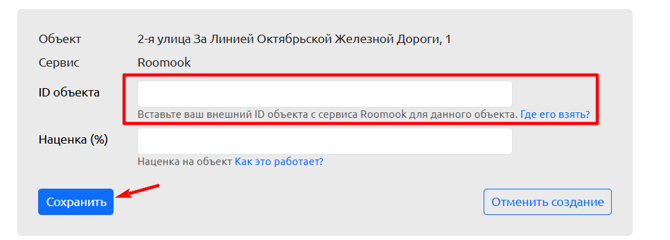 В поле «ID объекта» установите ID объявления «Roomook». При необходимости поставьте наценку.