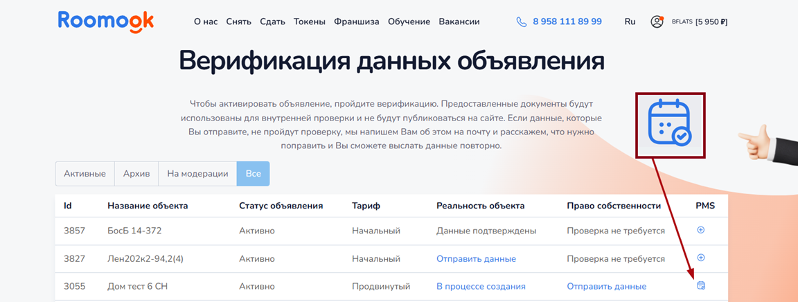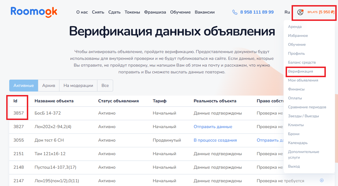 Войдите в аккаунт сервиса «Roomook» и перейдите в раздел личного кабинета «Верификация объявлений».