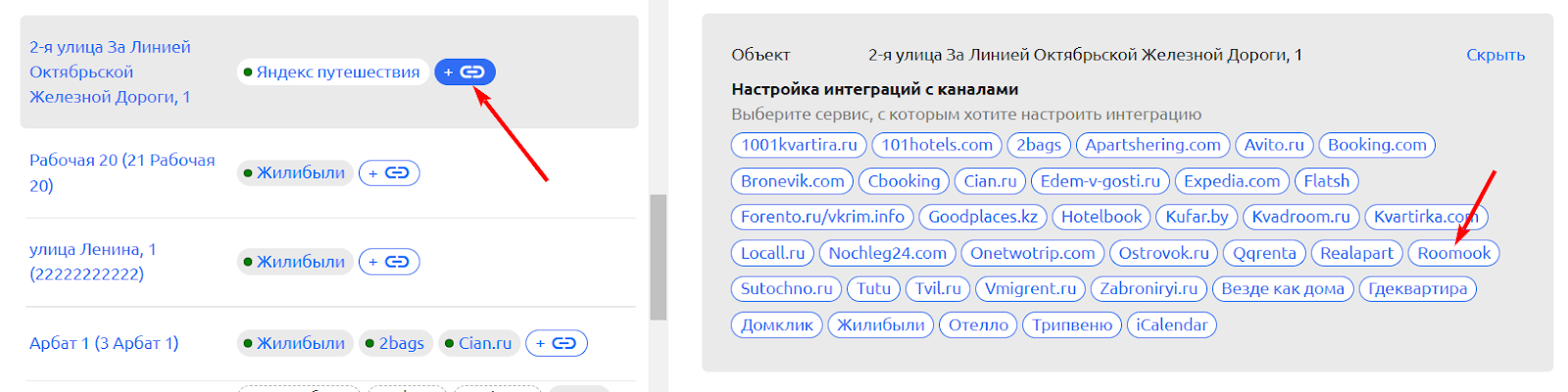 Напротив нужного объекта в списке нажмите на кнопку добавления синхронизации и выберите «Roomook».