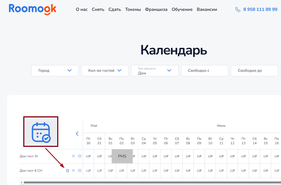 При успешном подключении: в разделе «Верификация объявлений» и в разделе «Календарь» у объявления появится значок активного подключения к PMS-системе.