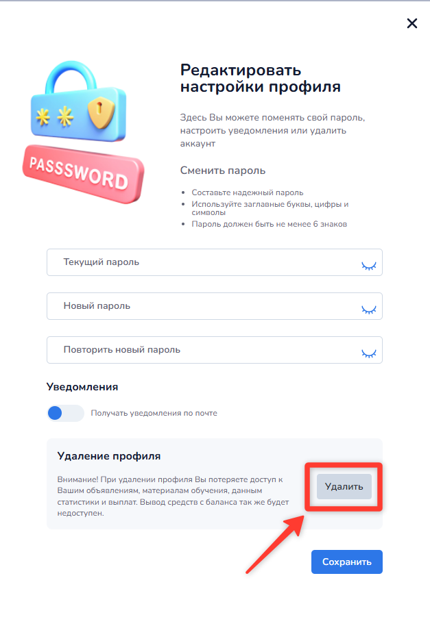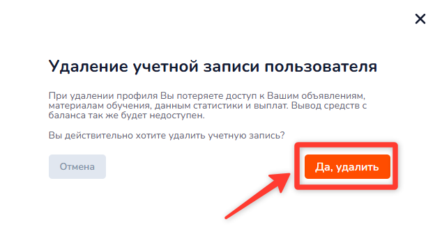 Внимание! При удалении профиля вы безвозвратно потеряете доступ ко всем своим объявлениям, материалам обучения, данным статистики и истории выплат. Вывод средств с баланса также станет невозможен.