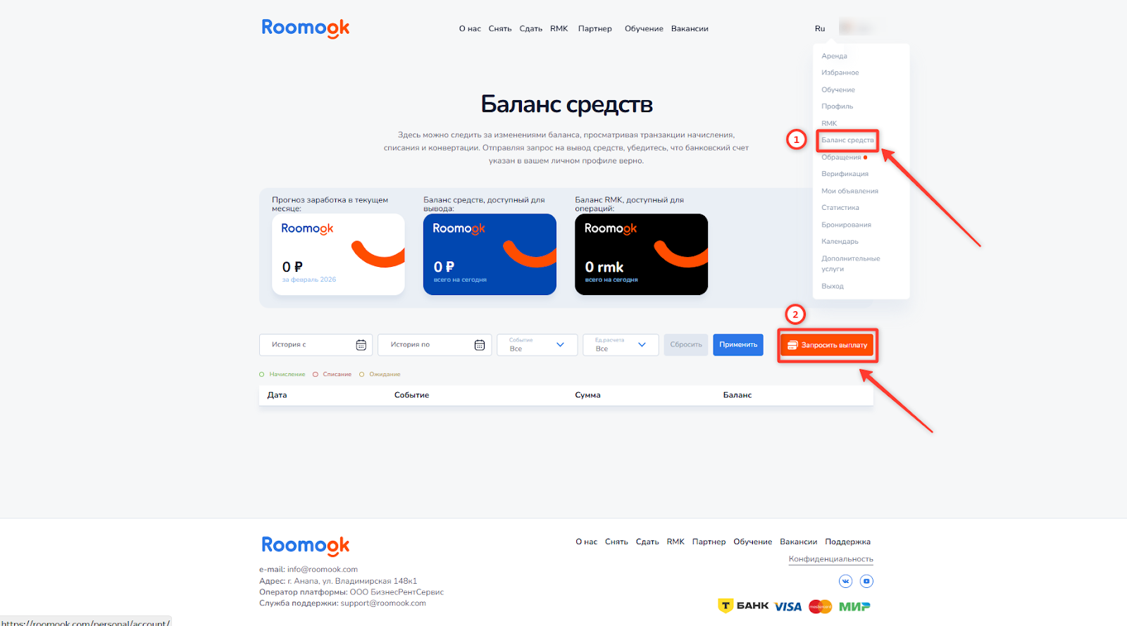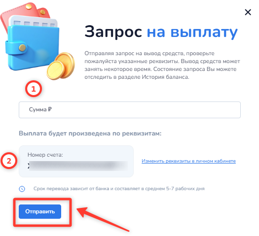 Для вывода денежных средств перейдите в раздел «Баланс средств». Там отображается ваша доступная сумма. Нажмите кнопку «Запросить выплату», и откроется форма.
